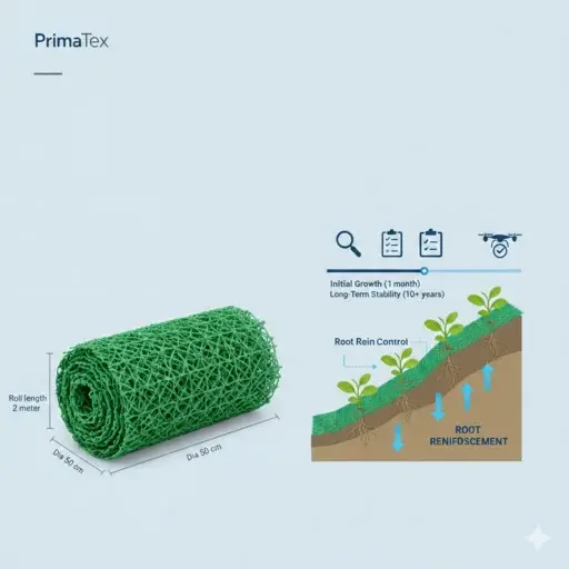 • Persentase Cakupan Vegetasi: Standar keberhasilan biasanya ditetapkan jika vegetasi telah menutupi lebih dari 90% area Geomat.